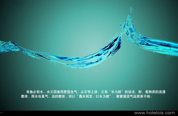 以水为财:有鱼必有水,水又因鱼而更显生气。从玄学上讲,又有“水为财”的说法,财,是物质的流通载体,而水也是气、运的载体,所以“遇水则发,以水为财”。寓意酒店气运长存,财源滚滚。