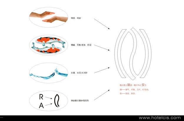 标志的主体设计元素RUIAN首字母,瑞安国际大酒店标志创意中虚的线条部分,代表酒店标志的第一个字母R,左右对称,更喻含国际化的酒店理念。