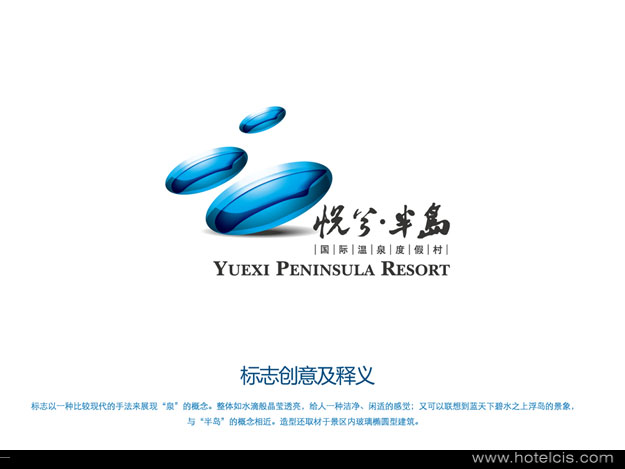 【人和时代·中国】专业温泉酒店度假村VI设计公司,悦兮半岛国际温泉度假村标志以一种比较现代的手法来展现“泉”的概念。整体如水滴般晶莹透亮,给人一种洁净、闲适的感觉;又可以联想到蓝天下碧水之上浮岛 的景象,与“半岛”的概念相近。造型还取材于景区内玻璃椭圆型建筑。