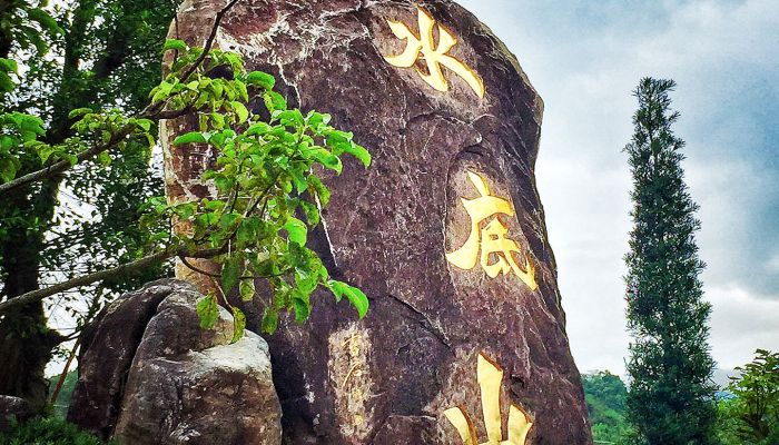 他的入口处才用了一个石头的精神堡垒,专门定制一个漂选,一个特色型的石头在上面用金色的毛笔来把水底山三个字描述在这地方,一出现一个主要的入口产生一个标准的打卡入口的地方,在这里采用的是水底山等形态字体,我们在酒店温泉标识的设计当中,以水为主题,水流为元素,晚上通过上下水流的发光关系,结合自然的主题,我们在自然主题的当中,以年轮的形式来呈现,粘人在于水的元素相结合 , 体现了整个水底山森林温泉的感觉。